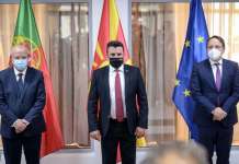 На средбата во Клубот на пратеници португалскиот министер за надворешни работи, Аугусто Сантош Силва и еврокомесарот за соседска политика Оливер Вархеји, пред премиерот Заев,...