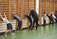 Почнува часот по физичко. Во салата, 31 ученик од второ одделение. Одделенската наставничка Тиљај Адеми ги реди децата во ред. Плеска со рацете и...