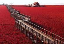 Стотици туристи на ден го посетуваат местото наречено црвена плажа во Кина и се фотографираат со ова уникатно опкружување.
