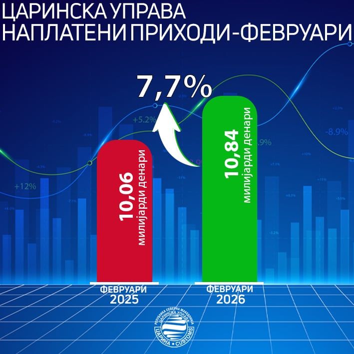 Царинската управа во февруари наплатила вкупно 10,8 милијарди денари, што претставува зголемување од 778,3 милиони денари или 7,7 проценти во однос на истиот период претходно, информираше управата на социјалните мрежи.