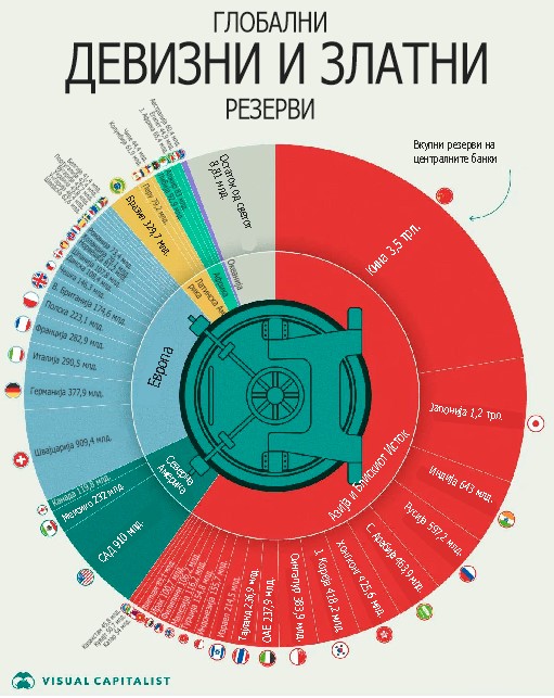 На графиконот што е претставен може да се види кои 50 земји во светот имаат најголеми резерви, односно станува збор за централни банки што ги имаат најголемите резерви во златни прачки или, пак, во други валути. Табелата е изработена од истражувачкиот центар „Вижуал капиталист“ (Visual Capitalist) врз основа на податоците од „Ворлд фактбук“ (The World Factbook). Табелата е направена врз основа на споредба на вредноста на резервите (девизни и злато) што ги поседувале светските централни банки во текот на 2024 година.