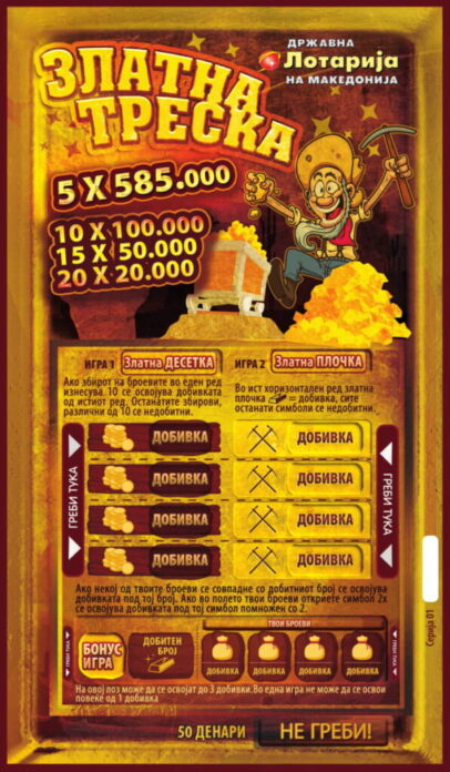 Серијата парични лозови има вкупно седум лоза од коишто „Мега Милионер“ ги нуди најголемите парични премии во вредност од 10.000.000 денари, 8 добивки по 1.000.000 денари и други големи парични добивки. Еден од најомилените инстант лозови „Макси златна рипка“, препознатлив по начинот за дознавање добивки носи премии вредни по 1.000.000 денари, а возбудливата „Златна Треска“ со дури три игри на еден лоз ги привлекува играчите со својот впечатлив дизајн и богата палета добивки меѓу кои 5 премии во вредност од по 585.000 денари.