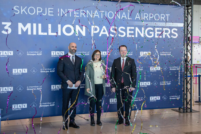 Раководството на аеродромскиот оператор во присуство на вицепремиерот и министер за транспорт Алекснадар Николоски приреди изненадување за три милионитиот патник, кој доби бесплатни аеродромски услуги од сестринските компани на ТАВ и два бесплатни билета од Виз Ер.