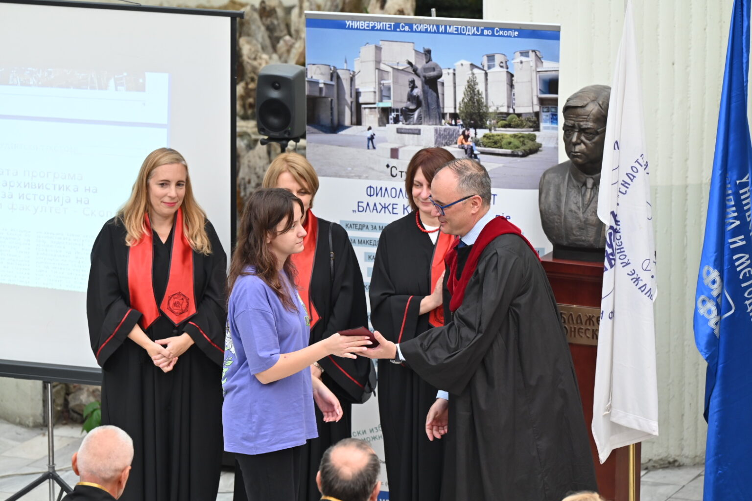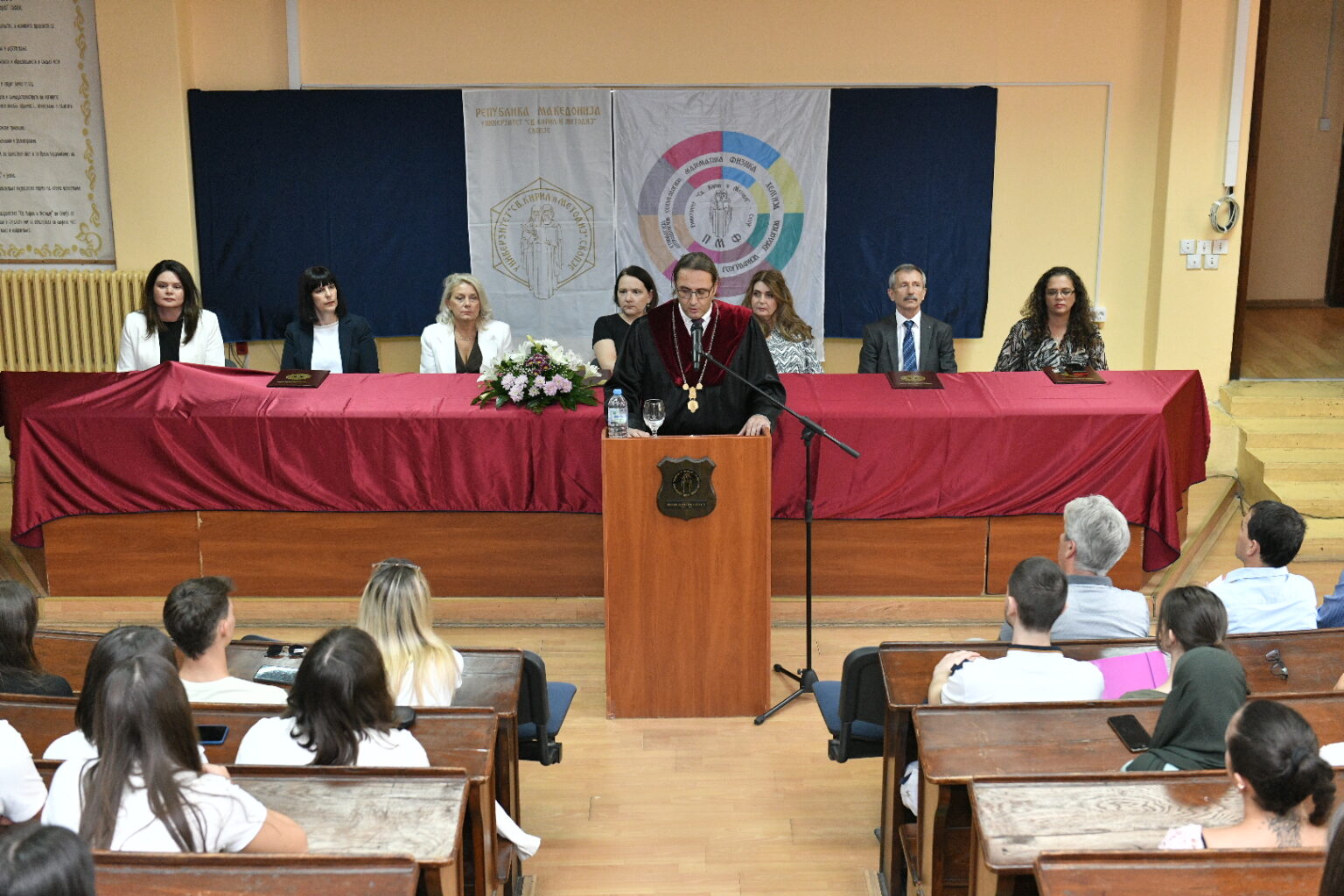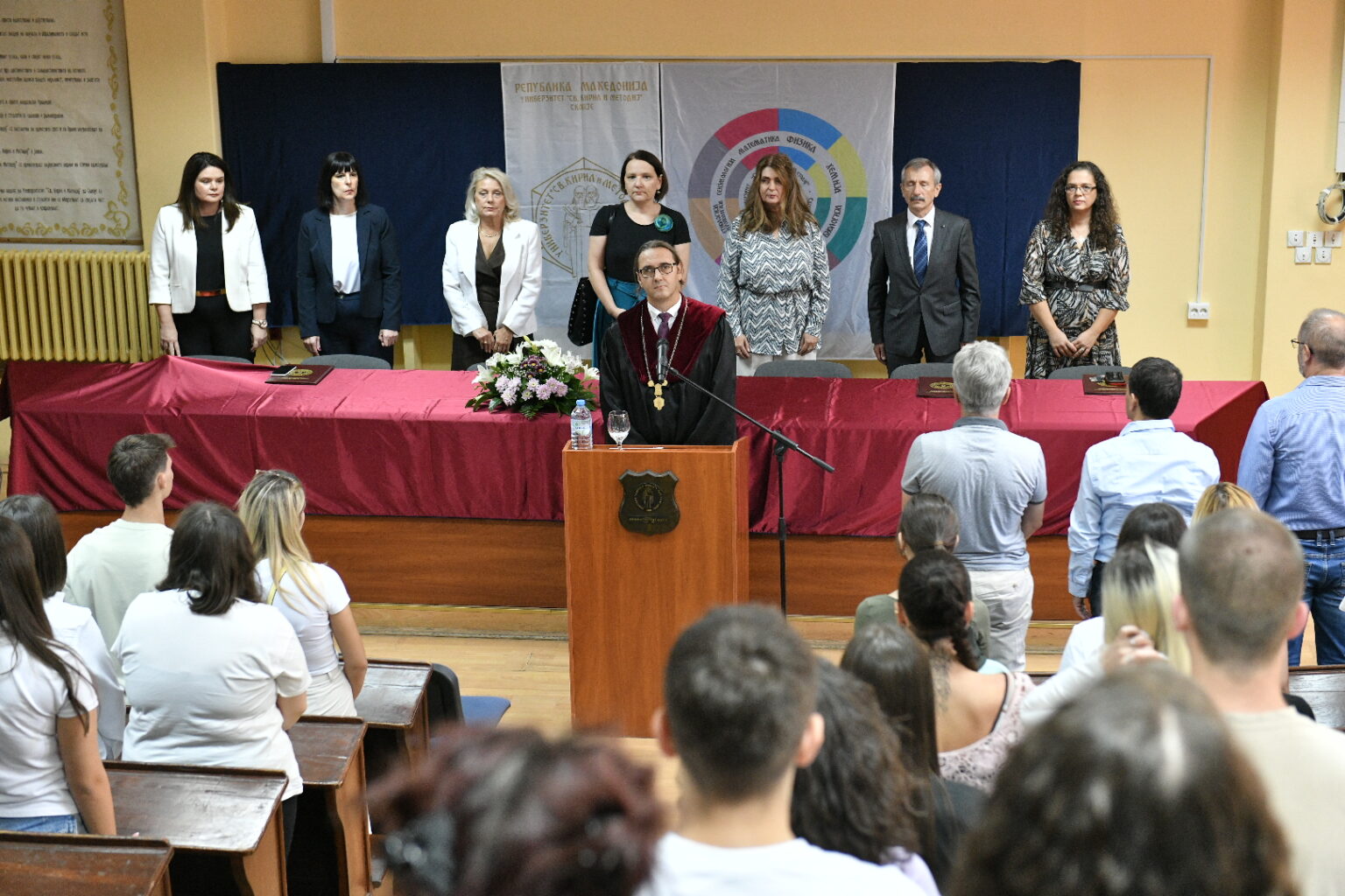 Заедничката аула на Филозофскиот факултет и Филолошкиот „Блаже Конески“ при Универзитетот „Св. Кирил и Методиј“ – Скопје денес беше полна со нови и студенти кои се запознаваа со просториите, кампусот, новите колеги и професори. Им се обрати новоназначениот декан на Филолошкиот факултет проф. д-р Владимир Мартиновски, кој покрај посакувањето успех ги претстави и новите програми на катедрите. Потоа заедно со деканот на Филозофскиот факултет, проф. д-р Ратко Дуев, ги доделија индексите на најдобрите 10 студенти запишани во прва година на двата факултета.