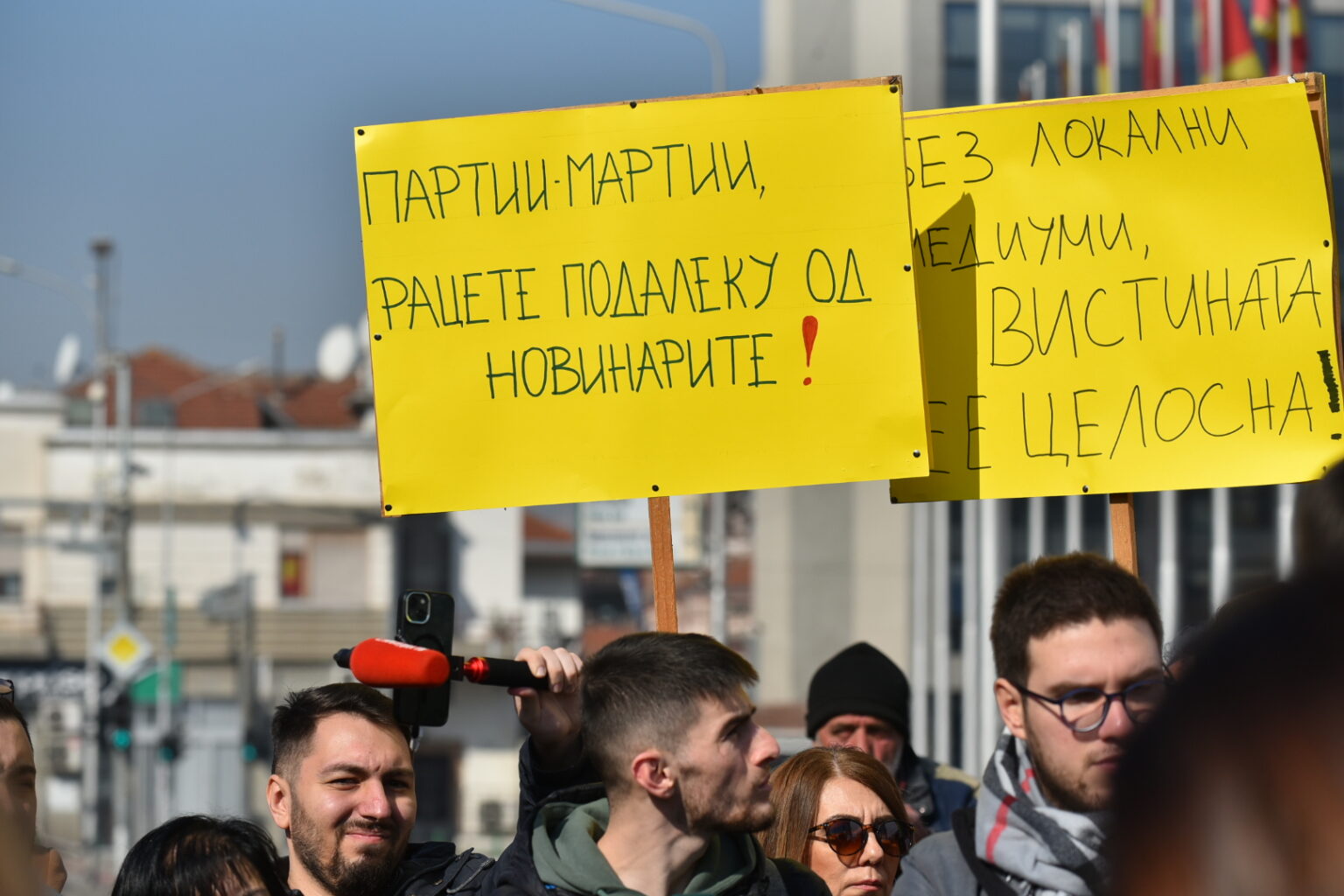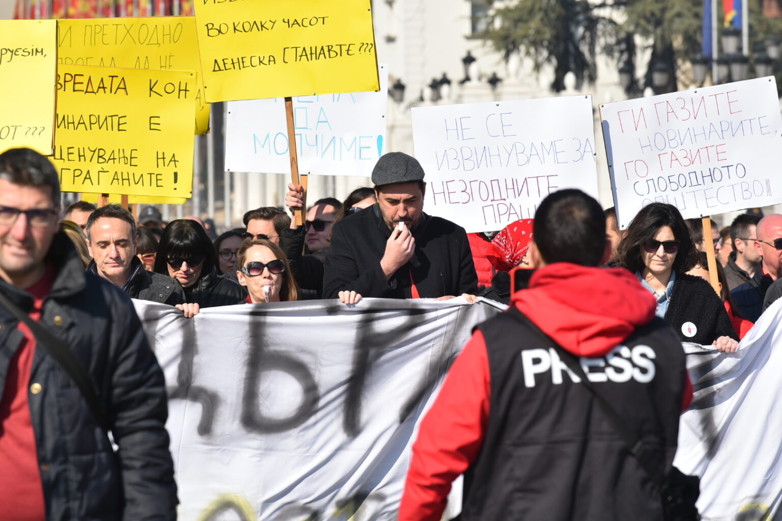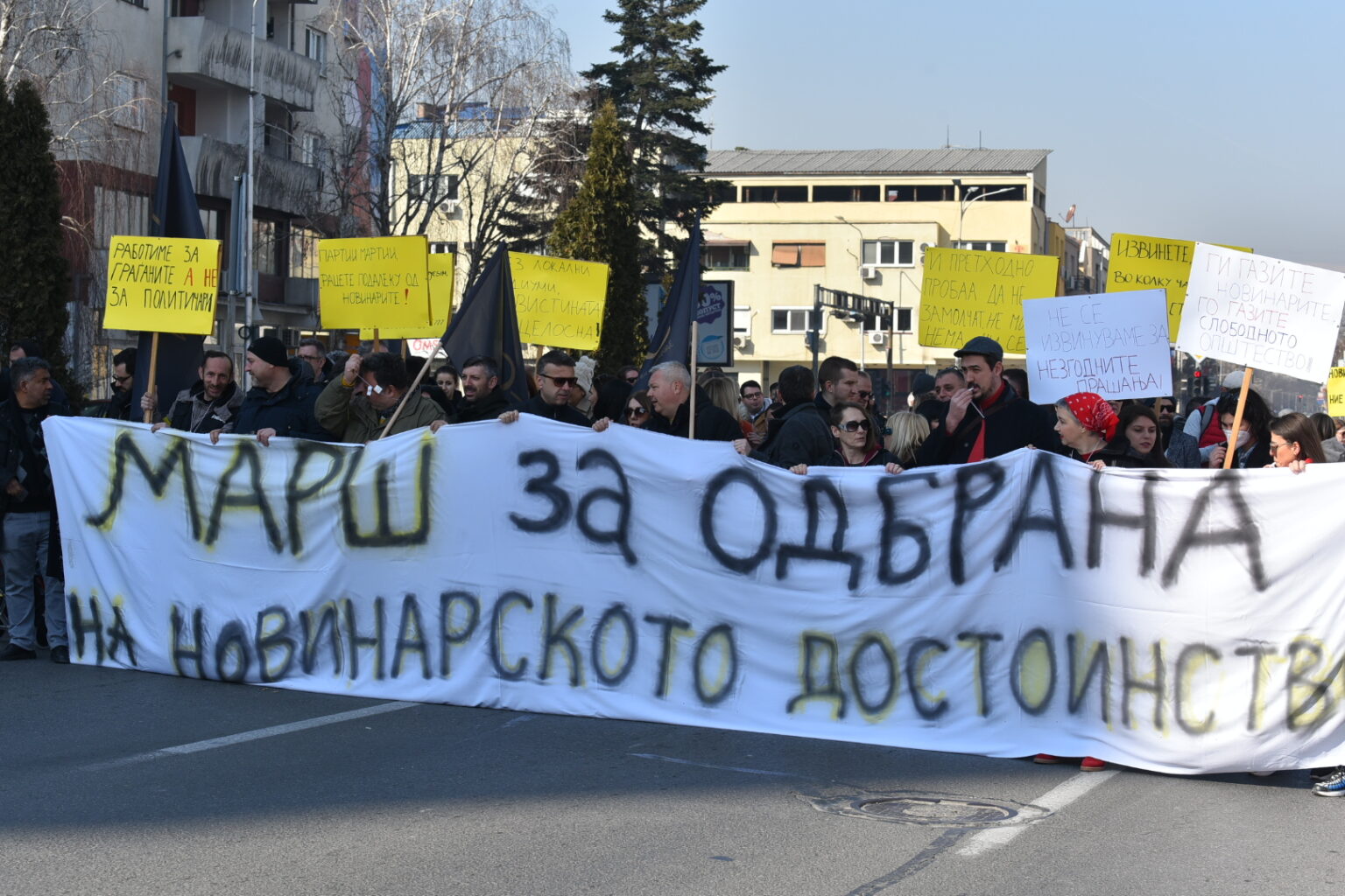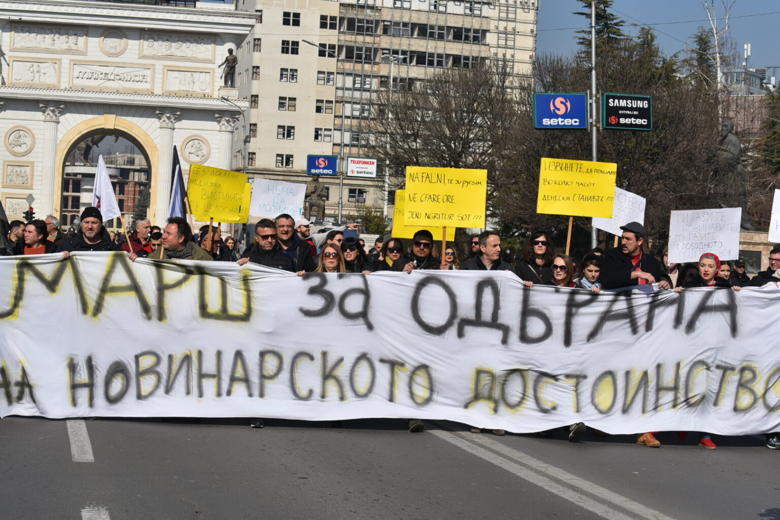 „Не се извинуваме за незгодните прашања“, „Ги газите новинарте, го газите слободното општество“, „Без локални медиуми вистината не е целосна“, „Новинарството на удар, ние сме обединети”, „Нема да молчиме”, „Сиромаштија = самоцензура“ се дел од пораките што новинарите и медиумските работници денеска ги испраќаат на протестен марш од пред Владата до Собранието.