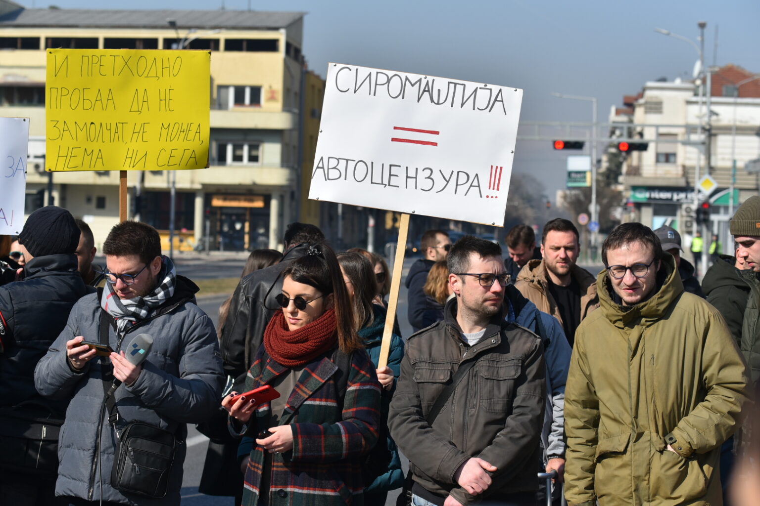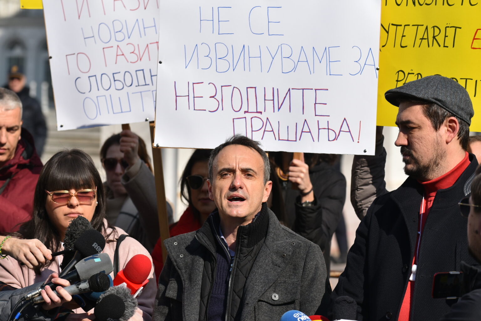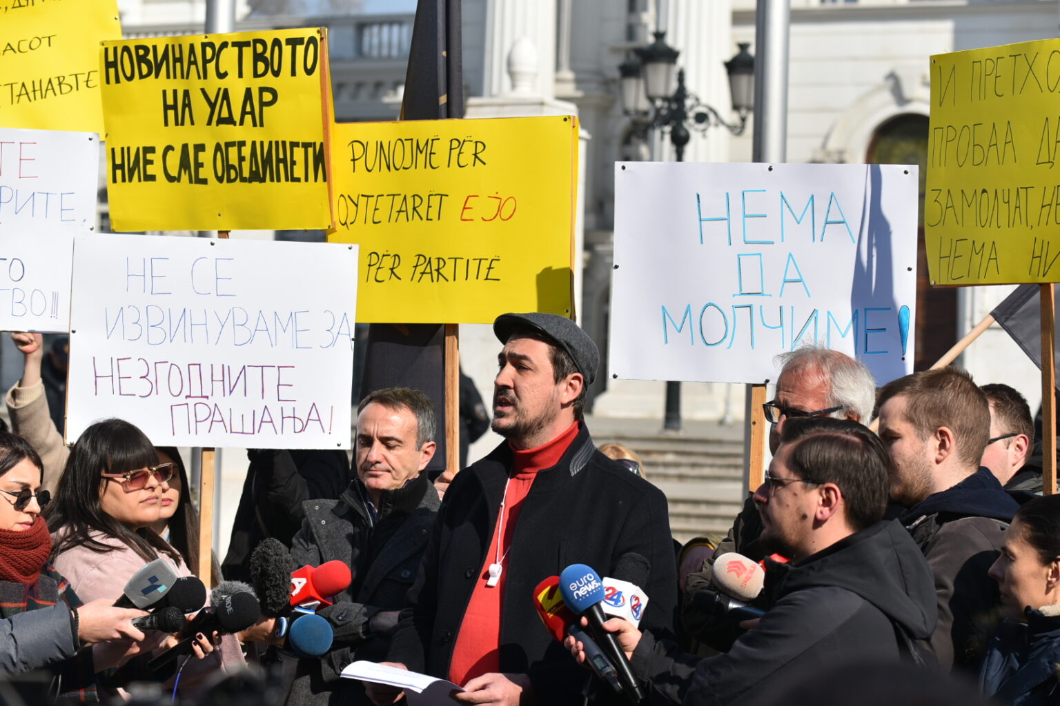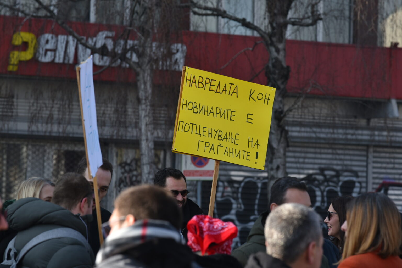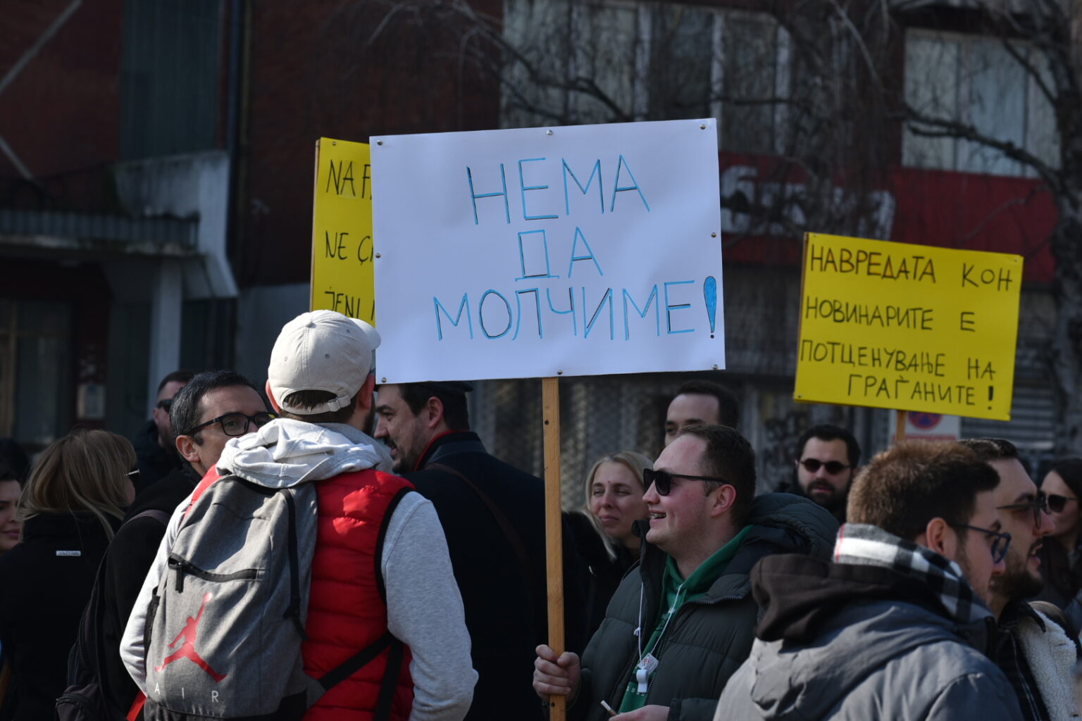 „Не се извинуваме за незгодните прашања“, „Ги газите новинарте, го газите слободното општество“, „Без локални медиуми вистината не е целосна“, „Новинарството на удар, ние сме обединети”, „Нема да молчиме”, „Сиромаштија = самоцензура“ се дел од пораките што новинарите и медиумските работници денеска ги испраќаат на протестен марш од пред Владата до Собранието.