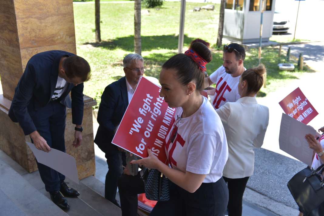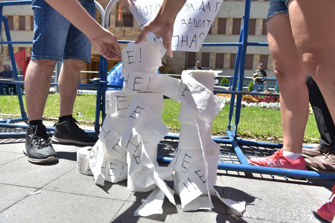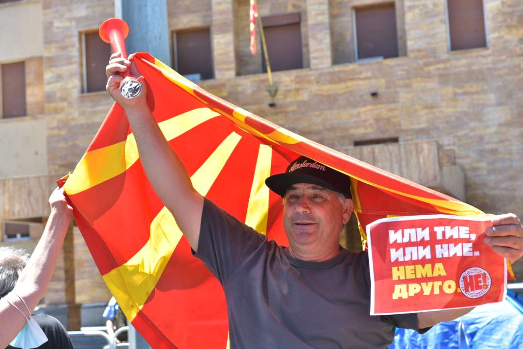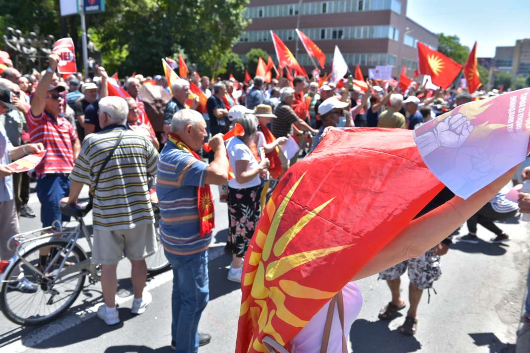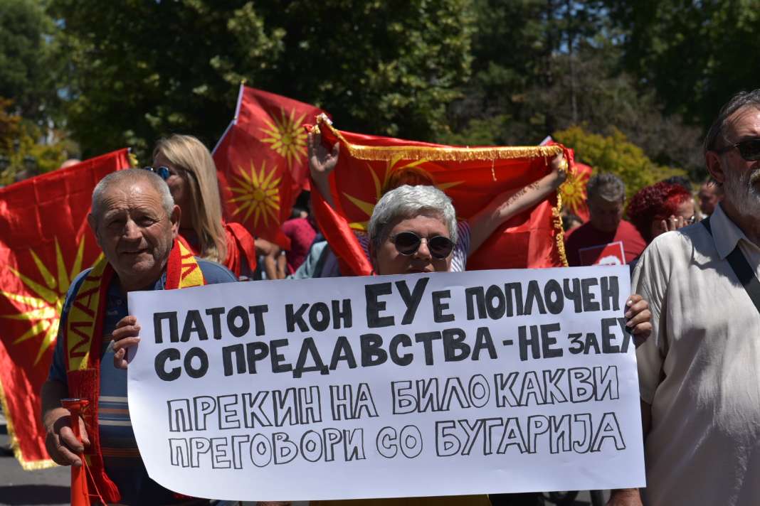 „Македонци уште се борат за своите правдини“, „Слободна ја сакаме, не сакаме протекторати“, „Стоп за бугаризација“ се дел од пораките на учесниците на протестот, кои се собраа со знамиња и транспаренти, а присутен е и претседателот на Левица Димитар Апасиев.