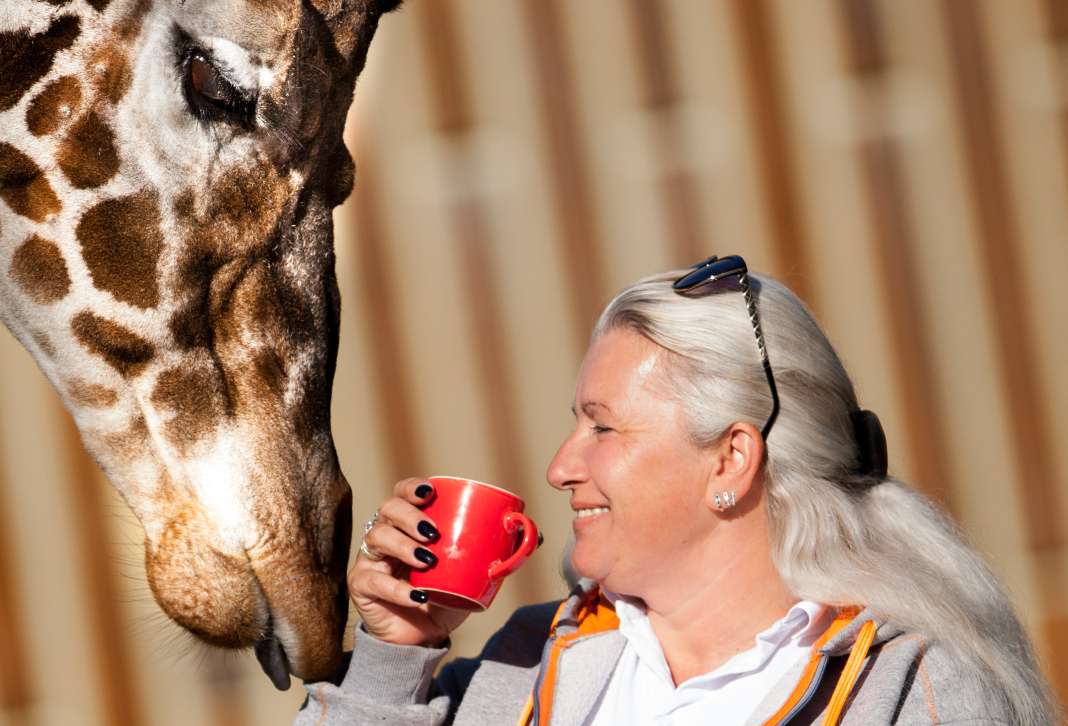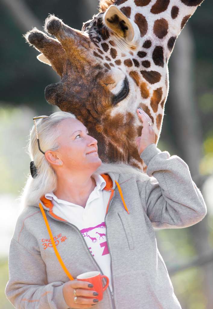 Негувателката Јасмина Трајковска во утринското кафе ужива со една од жирафите во скопската Зоолошка градина.