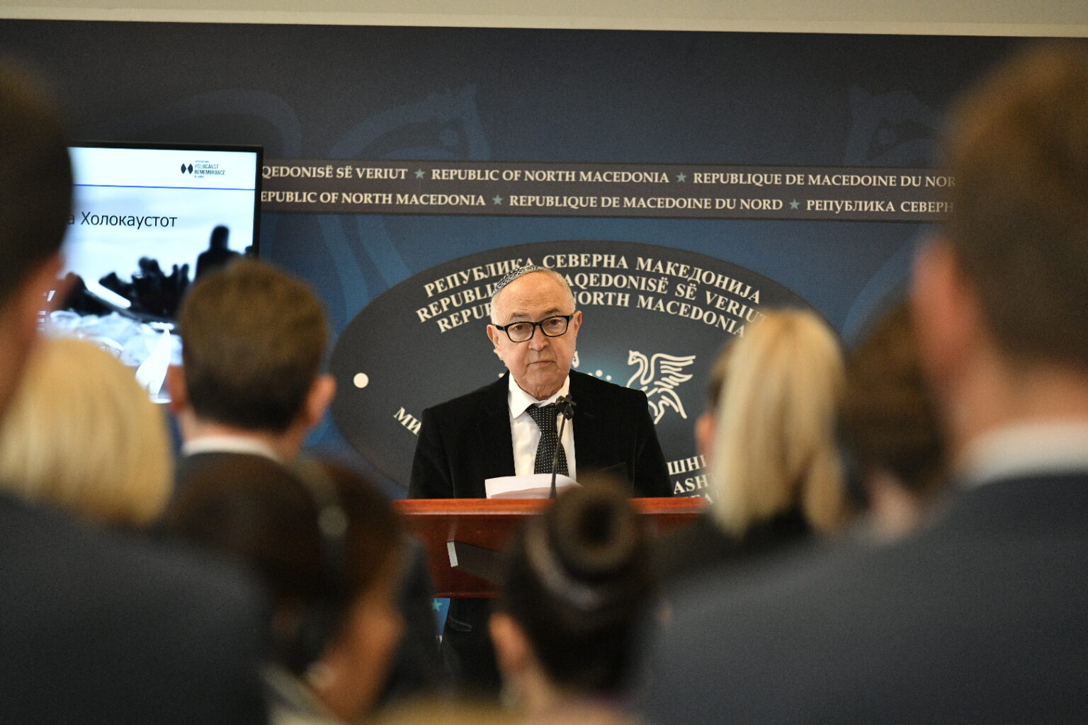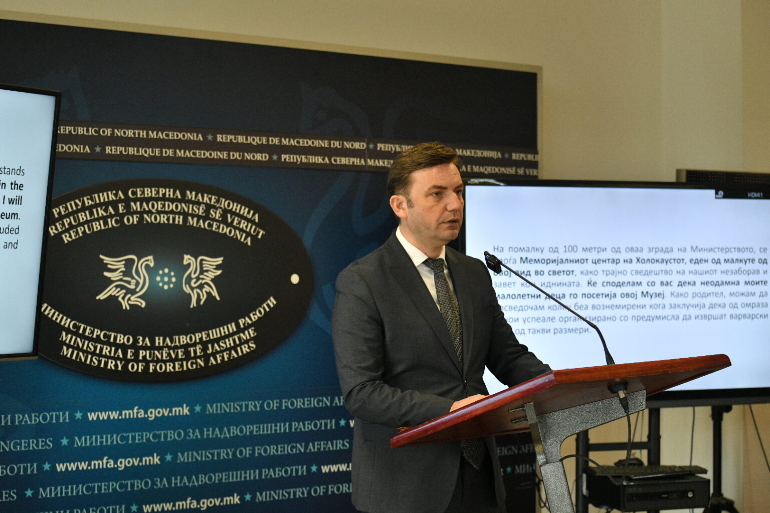 -Северна Македонија, горда на своето мултиетничко и мултикултурно општество, каде што секој граѓанин се чувствува свој на своето, независно од неговото име, потекло, јазик или вера, го чува и ќе го чува споменот на холокаустот, на 6-те милиони убиени Евреи, меѓу кои и 7.144 наши сограѓани, кои особено ќе ги споменеме повторно и на 11 март, на 80-годишнината од нивната депортација во Треблинка – истакна министерот.