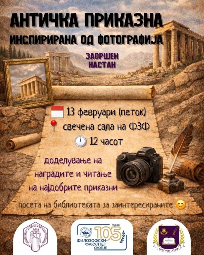 Утре со почеток во 12 часот, во салата за седници/свечената сала на Филозофскиот факултет во Скопје ќе се одржи завршниот настан од натпреварот „Античка приказна инспирирана од фотографија“, во организација на Институтот за класични студии при Филозофскиот факултет.