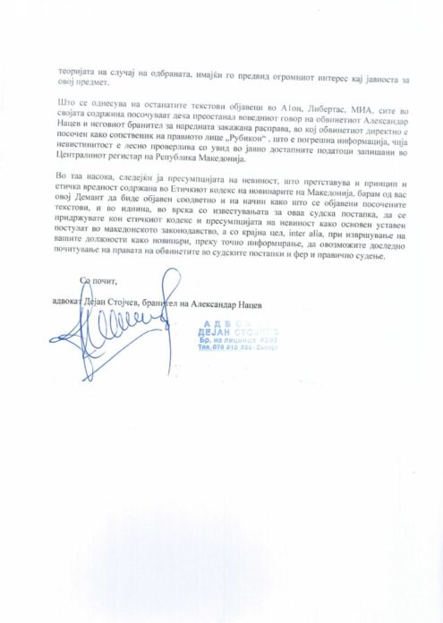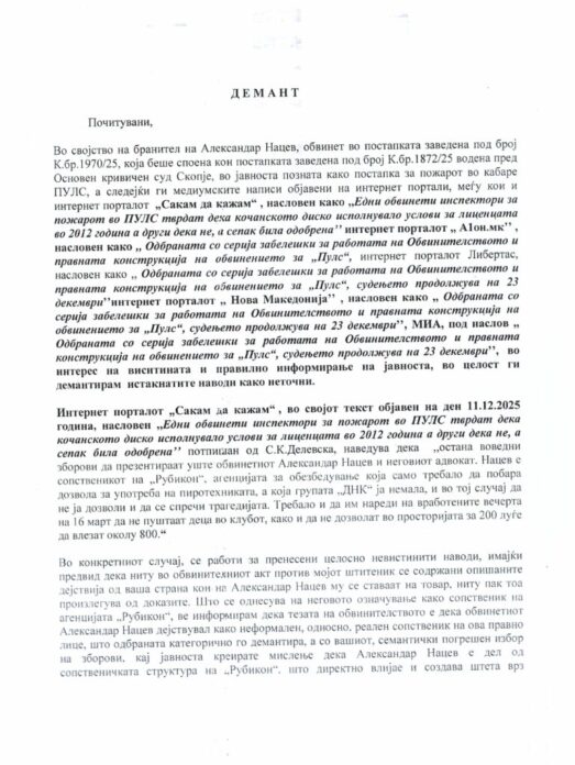 Во врска со написот објавен на 11 декември, во „Нова Македонија“, насловен „Одбраната со серија забелешки за работата на Обвинителството и правната конструкција на обвинението за ПУЛС, судењето продолжува на 23 декември“, пренесен од МИА, адвокатот Дејан Стојчев кој го застапува Александар Нацев, испрати реакција со демант.