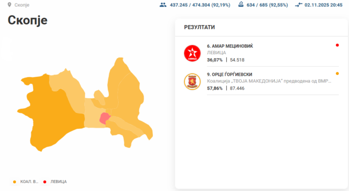 Според првичните резултати на ДИК во вториот круг за градоначалници во две од четири скопски општини водат кандидатите на ВМРО-ДПМНЕ, во Аеродром и Карпош, во Центар води кандидатот на СДСМ и Коалицијата, додека во Шуто Оризари кандидатот на Унија на Роми и актуелен градоначалник Курто Дудуш.