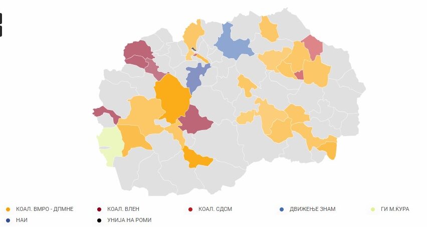 ВМРО-ДПМНЕ води во Град Скопје, Аеродром, Валандово, Виница, Дебарца, Демир Капија, Дојран, Долнени, Карпош, Кичево, Кочани, Лозово, Македонски Брод, Неготино, Могила, Пробиштип, Росоман, Чешиново-Облешево и Чучер Сандево.