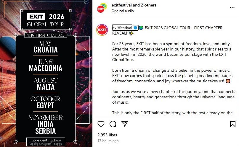 Познатиот регионален фестивал „Егзит“ (EXIT) објави дека, во рамки на својата светска турнеја „EXIT Global Tour“, следната година ќе се одржи во повеќе земји, меѓу кои и Македонија. Според објавата на официјалниот Инстаграм профил на „Егзит“, првите дестинации за 2026 Exit Global Tour година се Египет, Индија, Малта, Хрватска, Македонија и Србија.