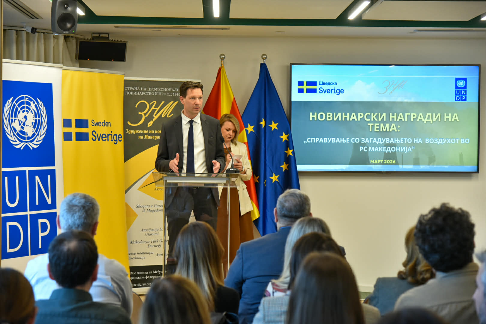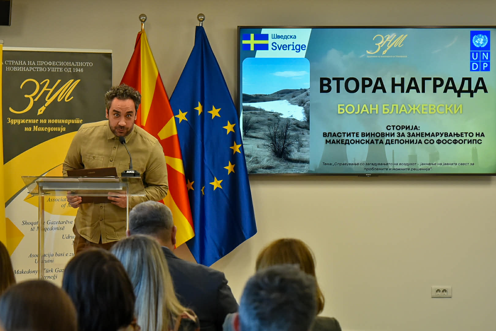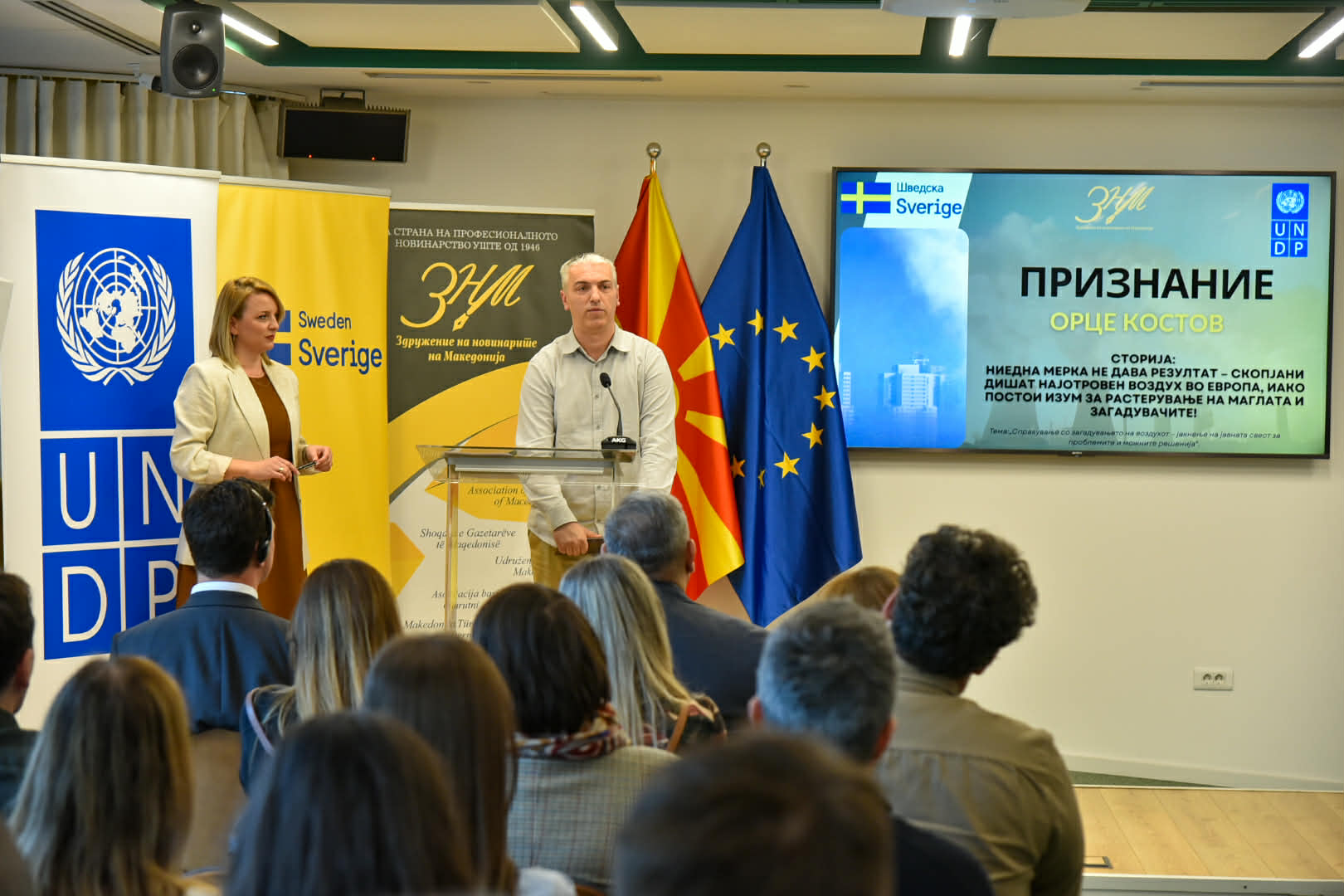 Здружението на новинарите на Македонија (ЗНМ), во соработка со Програмата за развој на Обединетите нации (УНДП) со финансиска поддршка од Шведска, денеска ги додели наградите за најдобри новинарски стории за 2025 година на тема: „Справување со загадувањето на воздухот – јакнење на јавната свест за проблемите и можните решенија“.
