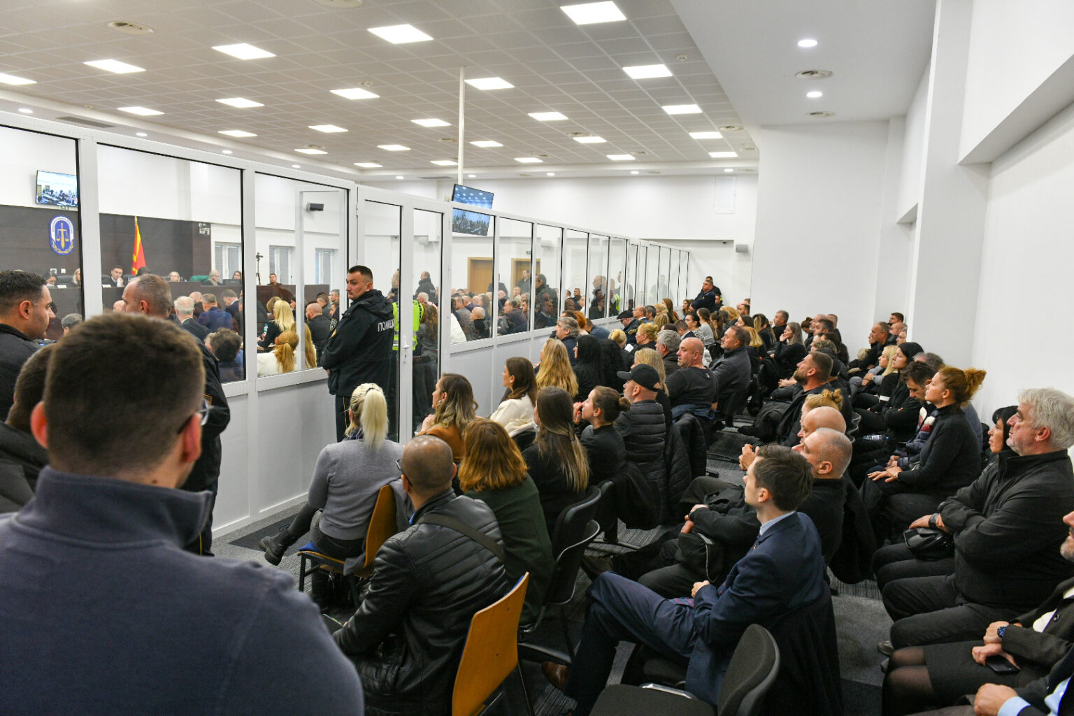 Судењето се одвива под засилени безбедносни мерки. Покрај обвинетите, во судницата се присутни и родни на настраданите во несреќата што се случи на 16 март, претставници на обвинителството, на одбраната, новинари.