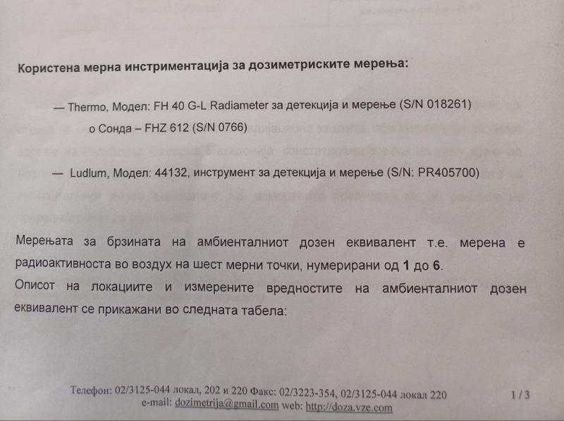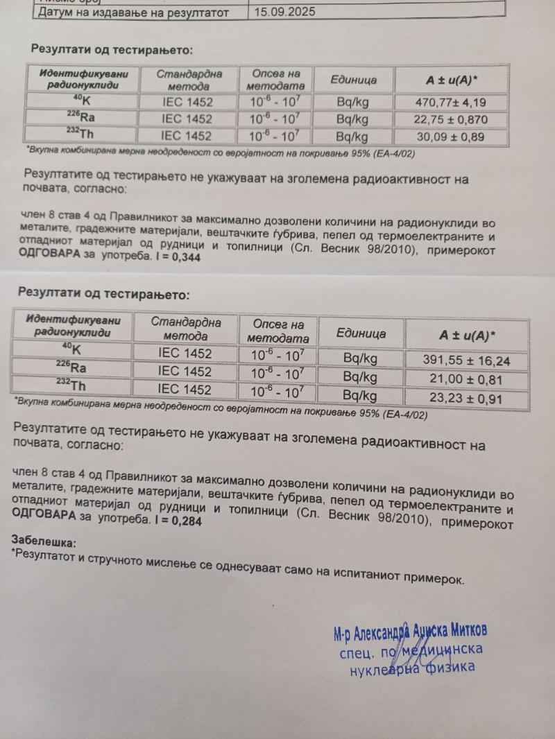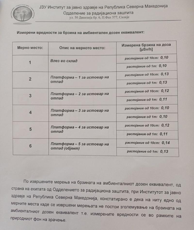 – Во текот на вчерашниот ден испративме обучен експертски тим од Институтот за вонредна контрола во засегнатото подрачје. Земени се примероци (мостри) од вода, почва и воздух за испитување на радиоактивност, како и примероци од вода, водовод, бунари, почва за физичко хемиска анализа. Во текот на денешниот ден, во ИЈЗ добиени се резултати од воздух и почва, од примероците за испитување на јонизирачко зрачење (радијација) и истите се во нормални референти вредности, без отстапување. Резултатите од мострите од вода за испитување на јонизирачко зрачење, согласно методата по која се испитува ќе бидат достапни во текот на утрешниот ден – појаснуваат од ИЈЗ.