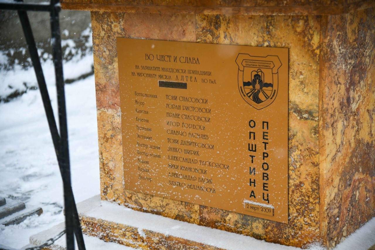 Во хеликоптерската несреќа, на денешен ден пред седумнаесет години, враќајќи се од мировната мисија АЛТЕА трагично загинаа потполковник Тони Спасовски, мајор Горан Ристовски, капетаните Бране Спасовски и Игор Ѓорески, наредниците Славчо Василев и Тони Давитковски, постарите водници Јанко Шириќ и Александар Тасковски, водниците Мики Ивановски и Александар Васиќ и десетарот Златко Вељаноски.