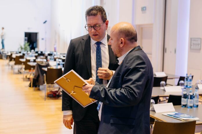 Претседателот на ФУЕН и пратеник во Европскиот парламент, Лорант Винце, и комесарот на Сојузната влада на Германија за прашања поврзани со етничките германски преселници и националните малцинства, Бернд Фабритиус, го посетија штандот на македонското друштво „Илинден“ – Тирана на конгресот на ФУЕН во Болцано, претставен меѓу штандовите на другите малцинства во Европа.