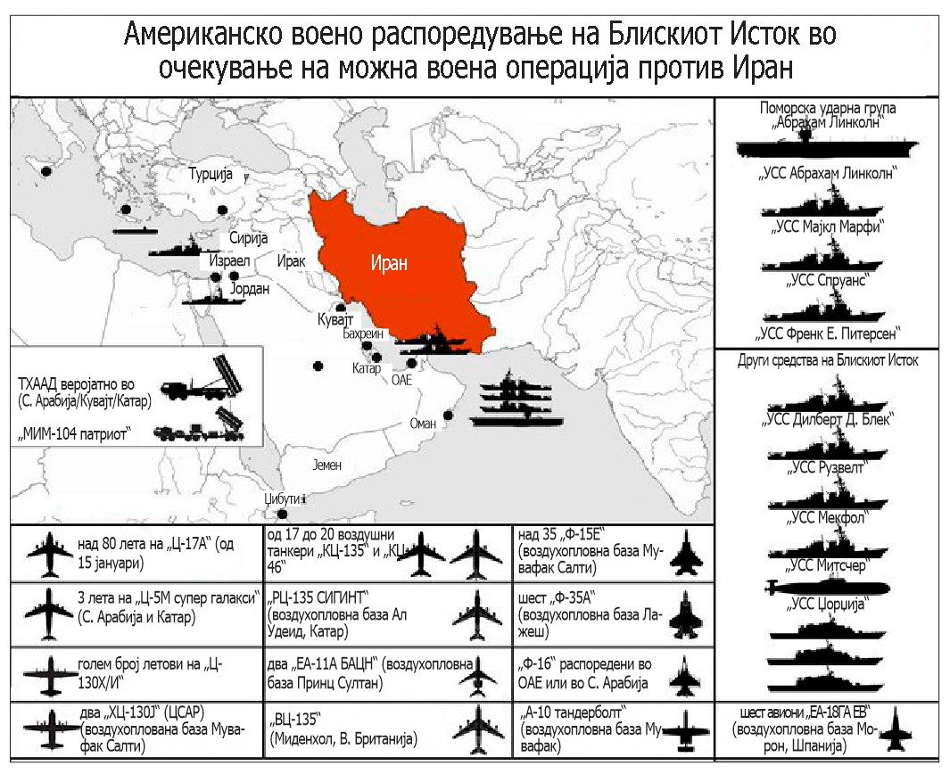 Американскиот претседател Доналд Трамп потврди дека Вашингтон испратил, како што ја опиша, „масивна и прекрасна армада“ на Блискиот Исток, предводена од носачот на авиони „УСС Абрахам Линколн“. Според официјалните објаснувања, целта на ова воено распоредување е да се изврши политички и воен притисок врз Техеран со цел прифаќање нов нуклеарен договор, а не започнување непосреден оружен конфликт. Исто така, Пентагон преместува дополнителни софистицирани оружја, како на пример оние од напредните системи за противвоздушна одбрана ТХААДT и „патриот“ во американските бази во Јордан, Кувајт, Бахреин, Саудиска Арабија и во Катар, како и на други локации на Блискиот Исток. Американски одбранбени претставници нагласуваат дека овој потег првенствено е одбранбен и има цел да ги минимизира можните последици од евентуални ирански напади врз американските и сојузничките цели.