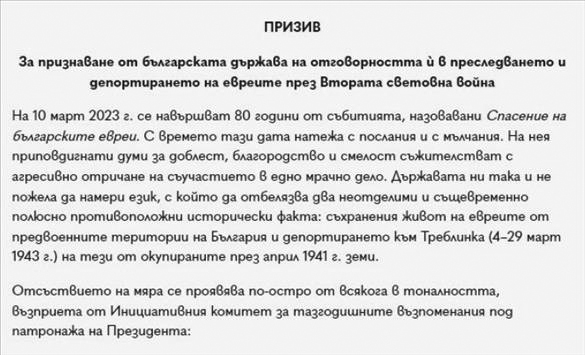 – Со текот на времето, овој датум (10 март) стана тежок со пораки и молк. Зборовите на храброст, благородност и храброст коегзистираат со агресивно негирање на соучесништво во едно мрачно дело. Нашата држава никогаш не сакаше да најде јазик со кој ќе означи два неразделни и во исто време поларно спротивни историски факти: зачуваните животи на Евреите од предвоените територии на Бугарија и депортацијата во Треблинка (4–29 март 1943 г.) од оние од окупираните земји од април 1941 година. Сметаме дека официјалните ставови за судбината на Евреите под бугарска власт за време на Втората светска војна систематски страдаат од историски банкрот и морален недостиг – пишуваат авторите на апелот.