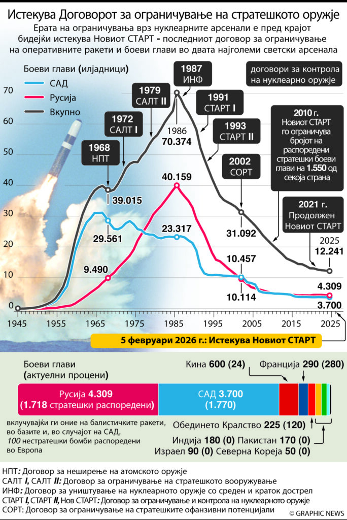 Истекот на договорот доаѓа во момент на длабока геополитичка конфронтација, нарушена доверба и парализирани канали за дијалог меѓу големите сили. Токму затоа, според аналитичарите, одлуката на администрацијата на Трамп нема да биде само техничко прашање на контрола на оружјето, туку стратегиски избор што ќе ја одреди насоката на светската безбедност во наредните децении.