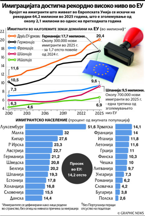 Бројот на имигранти во Европската Унија достигна историски максимум од 64,2 милиони во 2025 година – бројка што не само што поставува рекорд туку и сигнализира длабока структурна трансформација на европските општества. Според извештајот на Центарот за истражување и анализа на миграции при „РФБерлин“, кој се повикува на податоци од „Евростат“ и УНХЦР, ова претставува зголемување од околу 2,1 милиони луѓе во однос на претходната година. Во контекст на вкупното население на ЕУ од околу 450 милиони, ова значи дека речиси секој седми жител на Унијата е роден надвор од нејзините граници. Уште поиндикативен е податокот дека во 2010 година овој број изнесувал околу 40 милиони, што значи раст од повеќе од 60 отсто за само една и пол деценија.