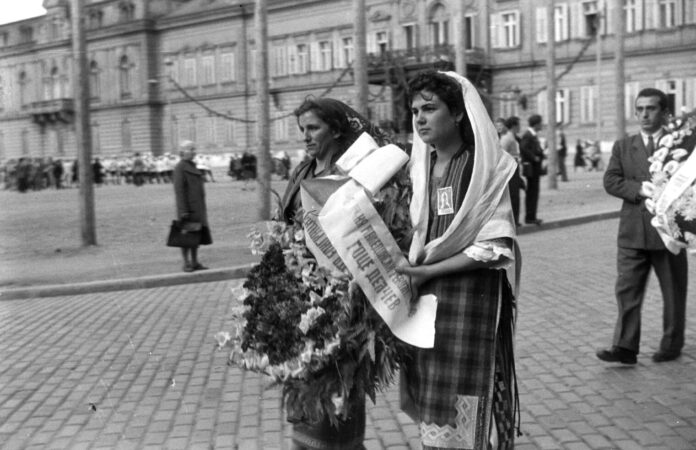 Жени во македонска носија држат венец со натпис „На големиот македонски револуционер Гоце Делчев“