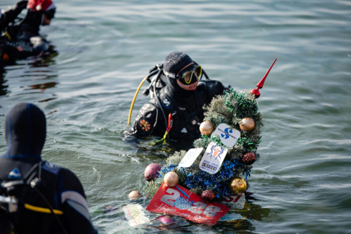 Новогодишната подводна елка традиционално поставена во Охридско Езеро од нуркачите од „Амфора“