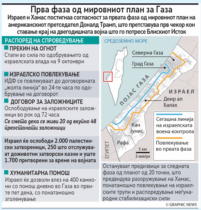 - Израелците го слават враќањето на заложниците од Газа додека Палестинците се враќаат во своите разурнати домови и го очекуваат враќањето на заробениците од Израел, по стапувањето во сила на прекинот на огнот изминатиот викенд. Остануваат прашањата за тоа кој ќе управува со Газа откако израелските трупи постепено ќе се повлечат и дали Хамас ќе се разоружи, како што е предвидено во договорот за прекин на огнот. Размерот на уништувањето на Газа ќе стане појасен ако се одржи примирјето
