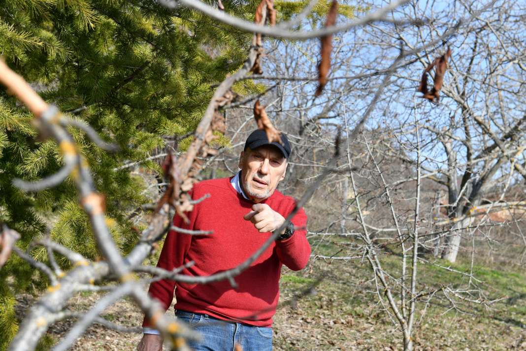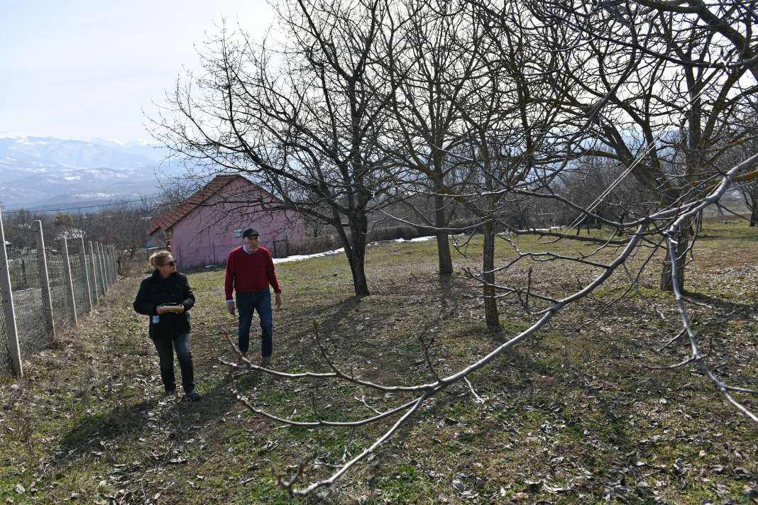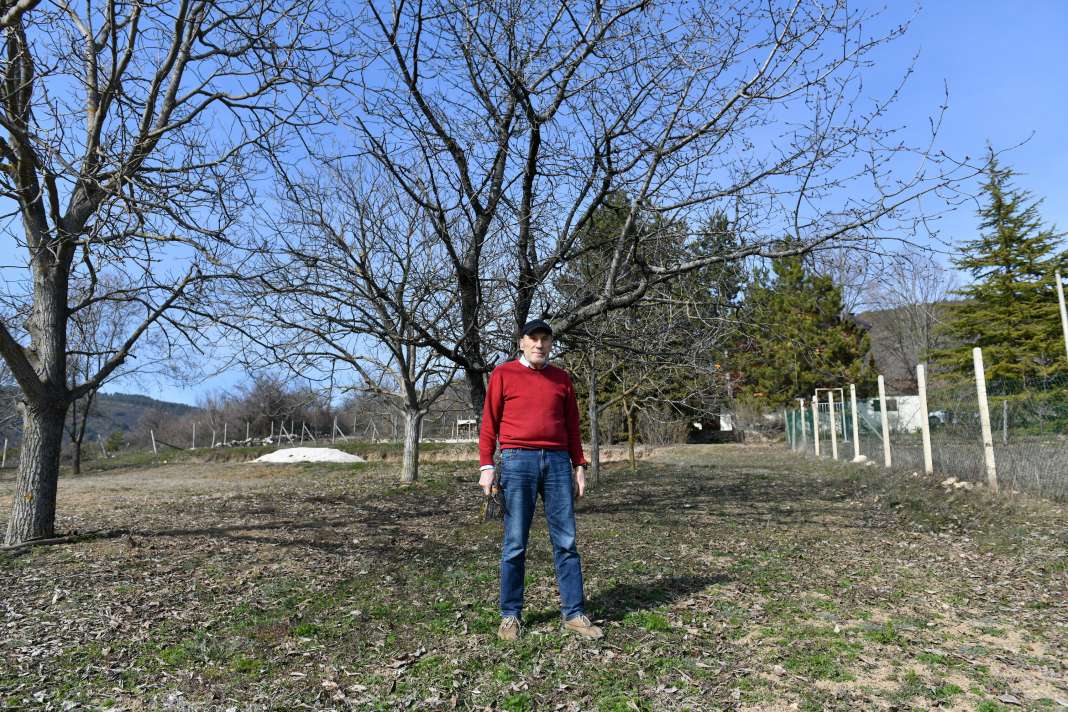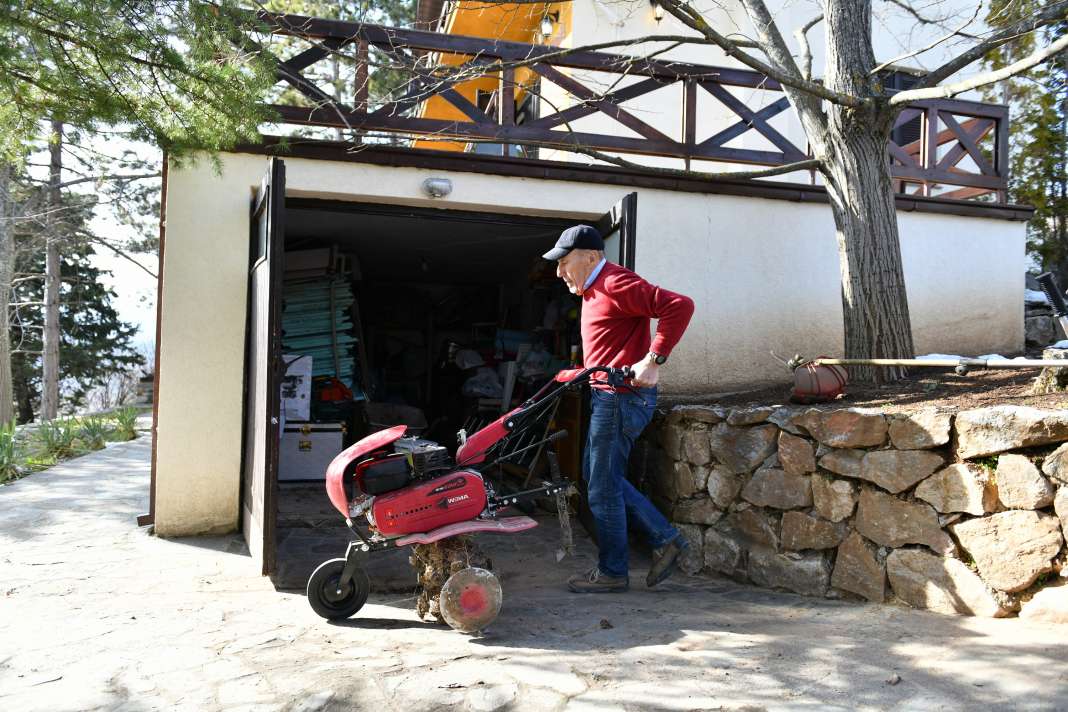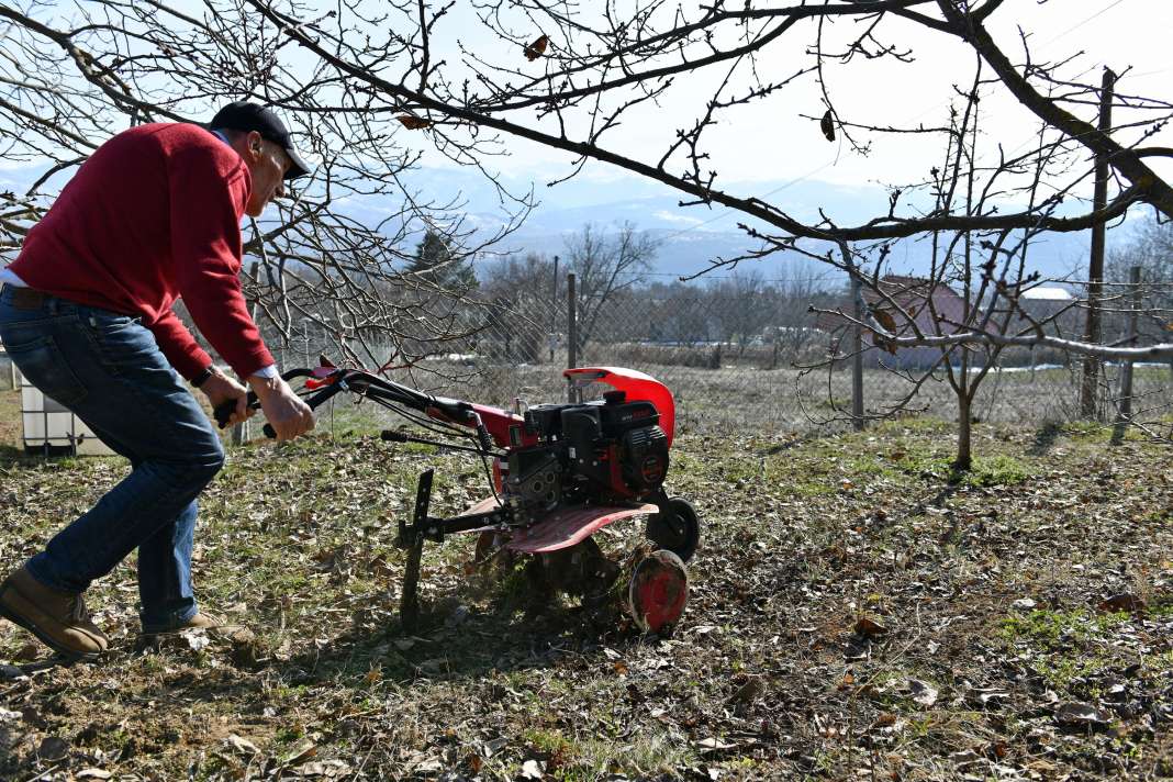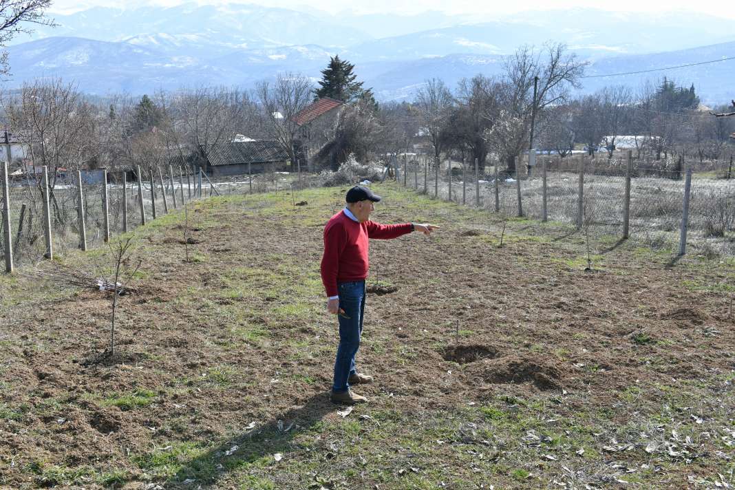 И му веруваме дека го вложил сиот труд зашто, невообичаено за тамошната со камен густо насеана почва, на неговата парцела стапалата постојано ни пропаѓаа во земјата додека им се восхитуваме на добро одгледаните овошки. Редовно ја орал земјата околу овошките со мотокултиватор, со кој посебно се гордее, како и со сите други земјоделски алатки што како драгоцена колекција ги чува во подрумските простории.