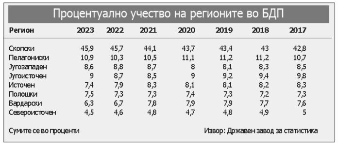 - Најновите податоци на Државниот завод за статистика (ДЗС) покажуваат дека состојбите не се промениле во насока на изедначување на регионите во процесот на нивниот економски раст и развој, туку напротив. Во согласност со објавата на ДЗС, во 2023 година најголемо учество во бруто-домашниот производ има Скопскиот Регион со 45,9 проценти, додека најмало учество има Североисточниот Регион со само 4,5 отсто