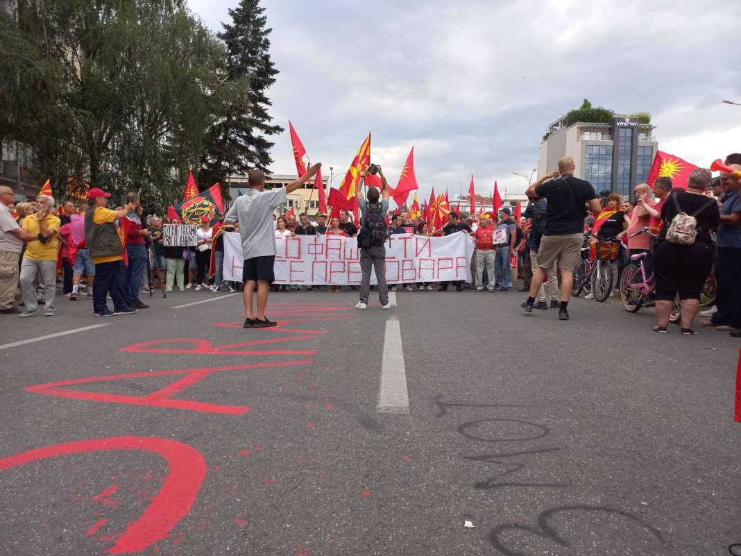 На булеварот „Илинден“ се уште стои паролата „Но пасаран“ (нема да помине – н.з.) испишана со црвени букви, а група млади луѓе со тапани го скандираат името „Македонија“. Може да се забележат и транспаренти „Сепак ние ќе победиме“ и „Стоп за бугаризација“, но главниот и најголем е „Со фашисти не преговараме“.