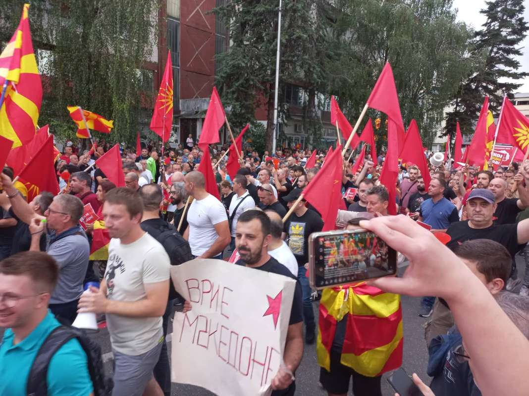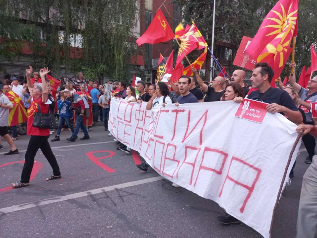 Граѓани со развиорени македонски знамиња и со маички на кои е напишано „НЕ“, како и „Навиваме за Македонија“, се дел од учесниците на протестот против францускиот предлог што вечерва почна пред Владата.