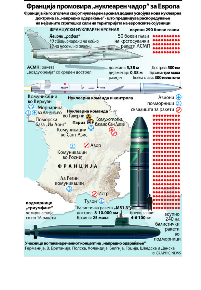 – Исто како што нашите стратешки подморници природно се распрснуваат низ океаните, гарантирајќи постојана способност за удар, нашите стратешки воздухопловни сили ќе можат да се прошират длабоко во европскиот континент – објасни францускиот претседател, нагласувајќи дека „ова распрснување низ европската територија ќе ги комплицира пресметките на нашите противници“.