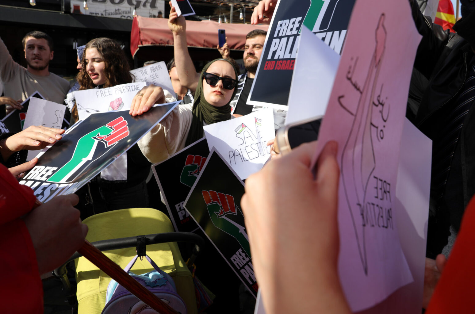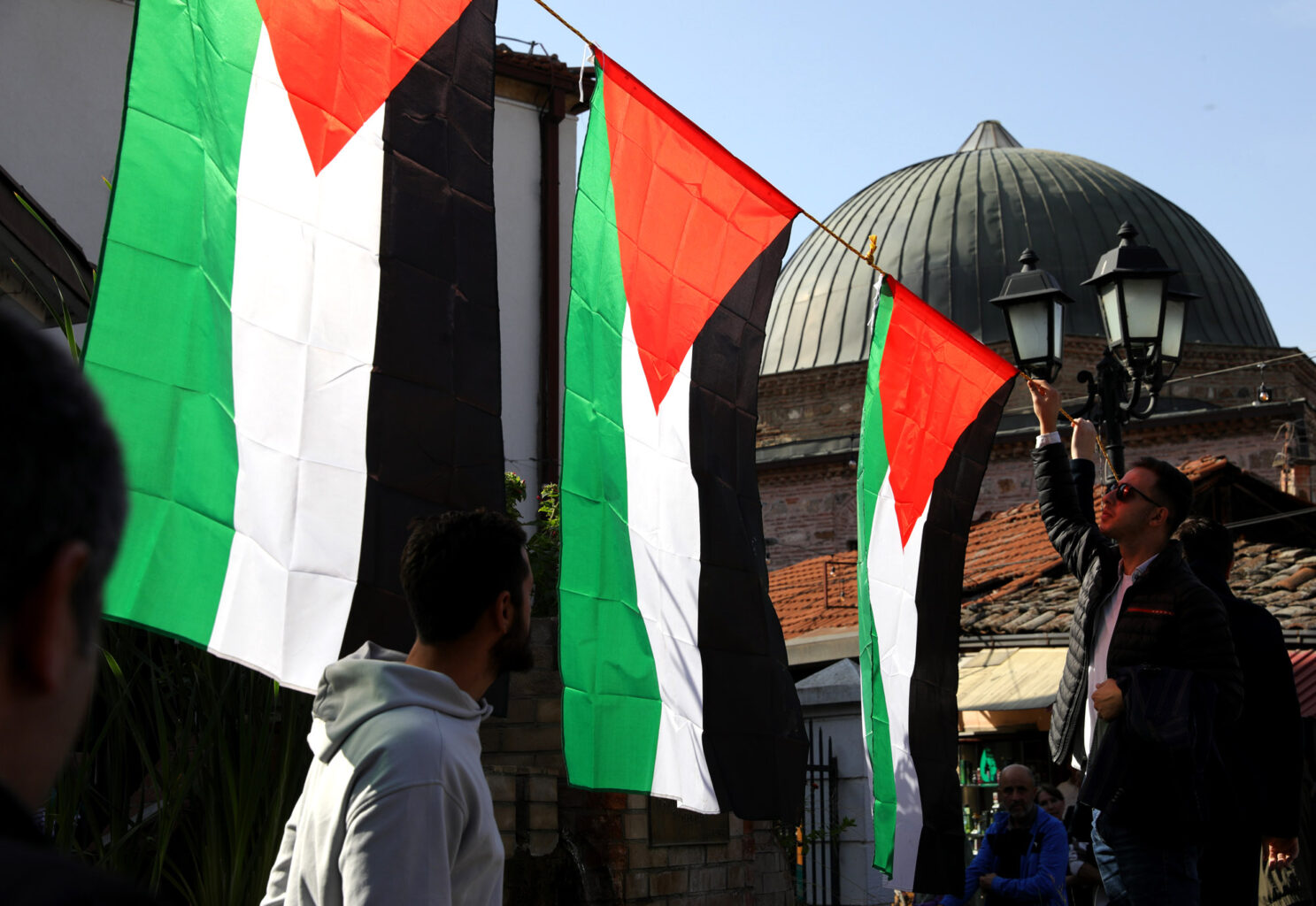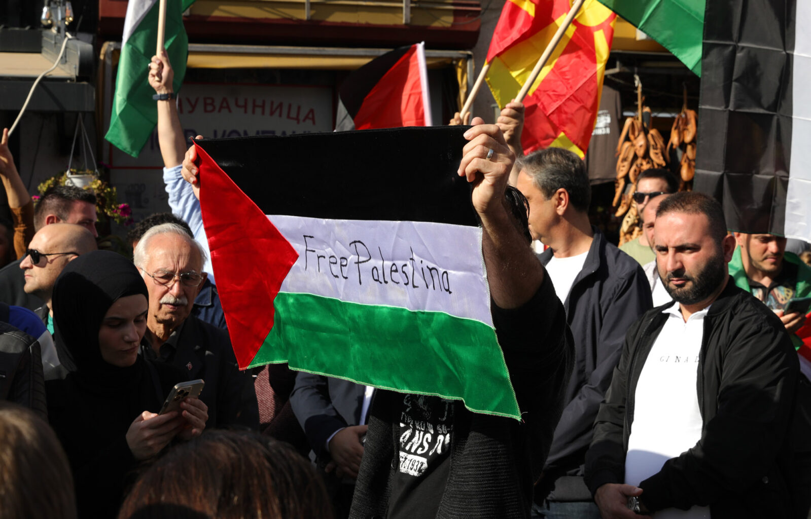 Група граѓани со транспаренти „Слобода за Палестина“ денеска се собраа на протест којшто се одржа пред Мурат Пашината Џамија во Старата скопска чаршија. Тие побараа „да престанат нападите во Палестина“.