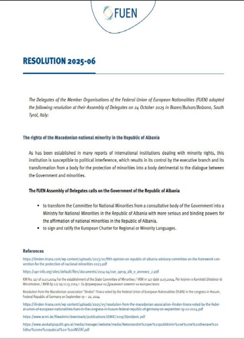 Резолуцијата усвоена од Федералната унија на европските националности (ФУЕН), а поднесена од Македонско друштво „Илинден“-Тирана, доставена е до сите албански и меѓународни институции, а заради запознавање и до македонските.