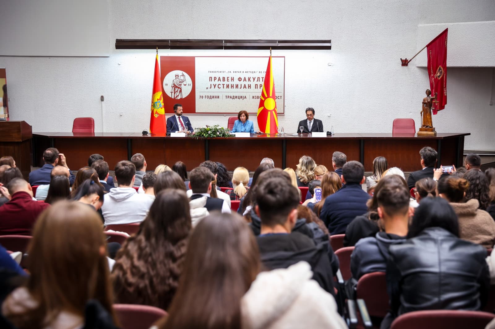 На Правниот факултет „Јустинијан Први“ во Скопје, претседателката д-р Гордана Силјановска-Давкова и црногорскиот претседател Јаков Милатовиќ, пред студенти, професори и други заинтересирани, одржаа заедничко предавање посветено на евроинтеграциите.