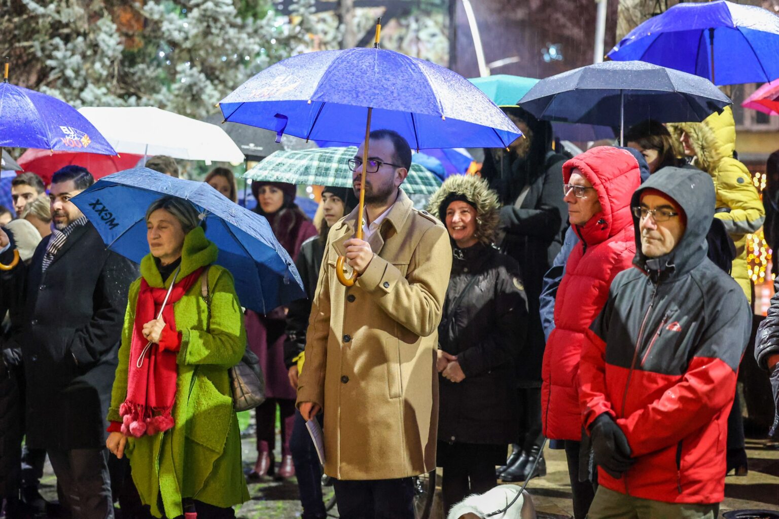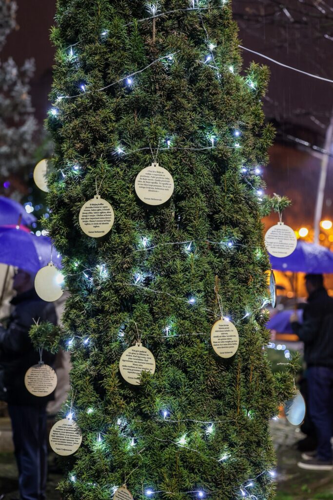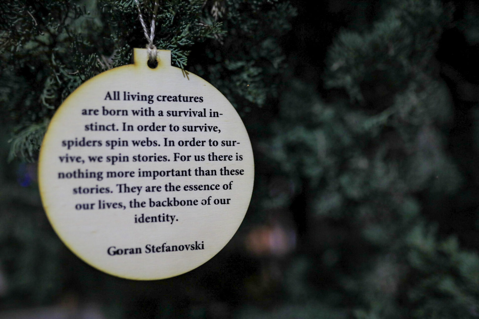 – Ги украсивме елките околу клупата на која седи Горан за да нѐ осветли неговата „искра што се измолкнува“. За да нѐ потсети дека „сѐ се движи. Птиците и јагулите, заедниците и поединците, атомите, молекулите. Постои миграција, во простор и време, ширење и мешање и повторно мешање на култури и форми и идеи. Тоа е суштинско нешто: метаморфоза, трансформација, спогодување и адаптација. Тоа е животот!“ – напишаа на фејсбук од Европската куќа во Скопје, кои и се организатори на настанот.
