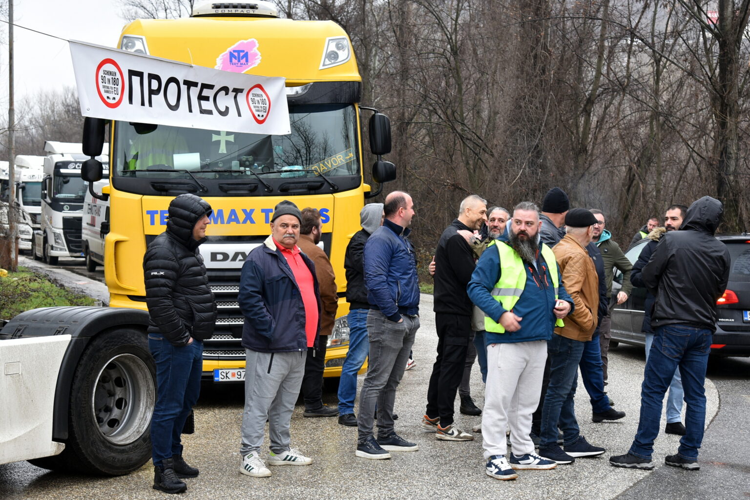 Товарниот сообраќај и натаму останува блокиран поради протестот на транспортните превозници од Западен Балкан кои од завчера поставија камиони на граничните премини кон шенген зоната барајќи од ЕУ да се измени правилото за електронска евиденција за престој во шенген-зоната во согласност со правилото 90/180 дена.
