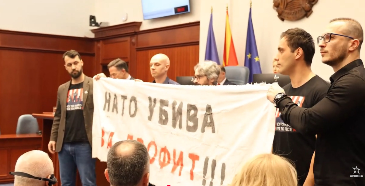 Пратениците на Левица денеска во Собранието излегоа со транспарент со натпис „НАТО убива за профит“ додека генералниот секретар на НАТО, Марк Руте, се обраќаше пред пратениците.