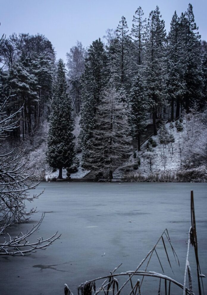 Фотографијата го претставува замрзнатото езерце се наоѓа во познатиот парк со илјада рододендрони – Регионален домен Солвеј – Замокот де ла Улп – во Белгија, сместен на југоисток од Брисел, кој е дел од големата шума Суањ.