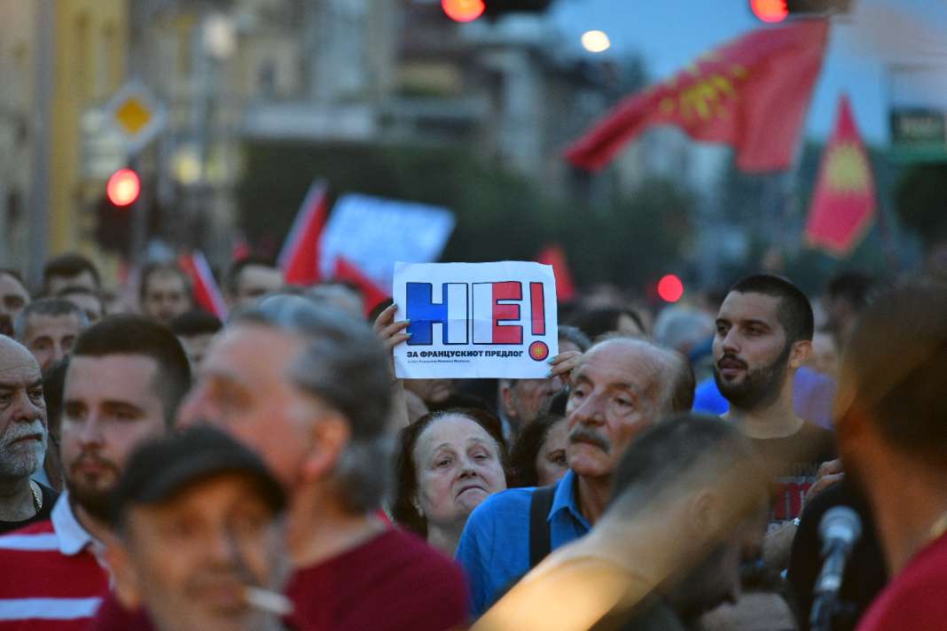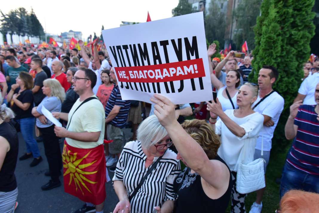 Пораки против францускиот предлог, апел да не се потпишува и барања за оставки се слушаа на вечерашниот протест пред Владата под мотото „Ултиматум – Не, благодарам“. Официјално немаше организатор, но беше поддржан од политички партии и граѓански организации кои сметаат дека предлогот од Франција е исклучително лош за македонскиот народ и македонските национални интереси.