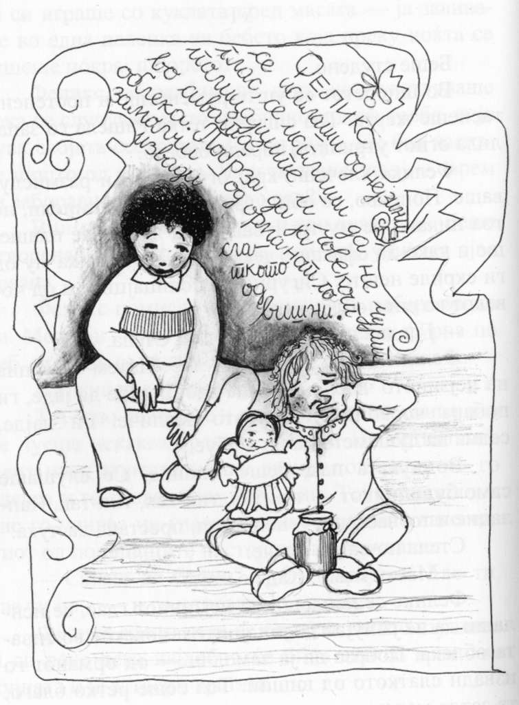 На Феликс му се сакаше да викне по татка си, да го потсети: „А Стела, а јас, тате?“ Срцето му тупкаше лудо. Во тишината го слушаше само него. Се плашеше, го болеше поради оние зборови на татко му: „Нема никого“. Но, сепак, седеше во долапот колку што можеше потивко и не се помрднуваше.