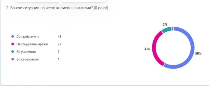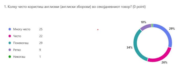 Во нашето училиште „Климент Охридски“ во Прилеп неодамна беше спроведена електронска анкета меѓу ученици на возраст од 10 до 15 години за тоа колку често користат англиски зборови во секојдневниот говор. Беа анкетирани 86 момчиња и девојчиња. Резултатите покажуваат дека повеќето од нив одговараат „често“ или „многу често“, а само мал дел велат дека „ретко“ или „никогаш“ не употребуваат англизми.