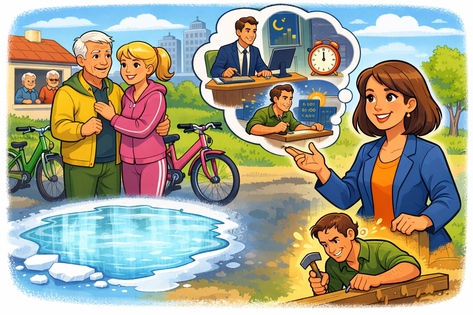 (Златниот и Златната слегуваат од велосипедите)