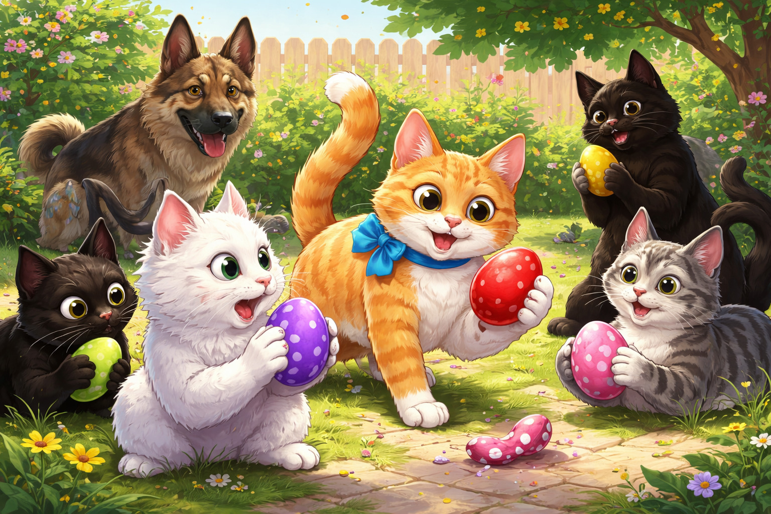 – Победив! – Среќно извика Тане. Го грабна јајцето и излезе надвор, меѓу своите мачешки пријатели. Мудирот Астор, белиот мачор Жаре, па дури и бандата црни мачки, сите држеа по едно бојадисано јајце во мачешките шепи. – Да се кршиме! – Предложи Тане. Мачките среќно удираа во јајцата, а тие, едно по едно, распукуваа. Цело остана само јајцето на мачорот Тане.