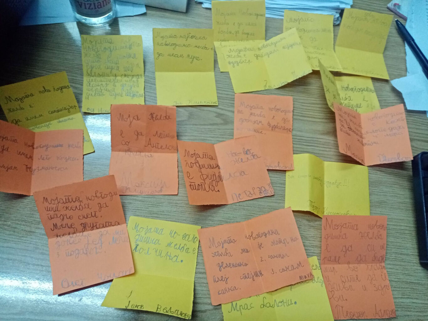 Второодделенците, со другата наставничка Софче Пеева, изработија и мини-елки, на кои ги закачија своите новогодишни желби. Каја посака сите да се живи и здрави, да нема војни и коронвирусот да не се врати никогаш повеќе. И желбата на Теодора е слична: Да има мир во светот и сите да се живи и здрави. Марија исто така посака мир во светот и да нема гладни деца, а Илина да стане уметница и да слика убави слики, за да ги разубави домовите на другите. Лина посака бел ’рчко, откако стариот ѝ угина, а Јан посака куче. Скромни се и желбите на Јана и Јована. Јана – да го дочека Дедо Мраз со мама, тато и бато и да ѝ донесе подароче затоа што изминатата година била умна. Јована – да ја накитат елката. Мила посака балони, а Тадеј да има многу здравје
