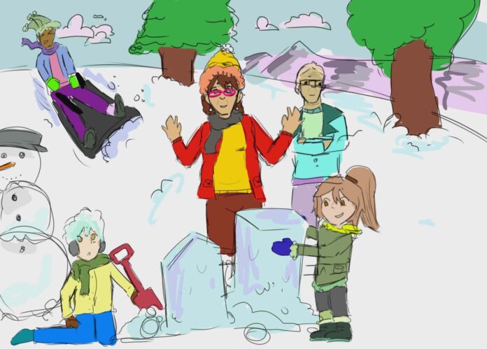 Татко ми и дедо помагаа и носеа снег, но, како што ги градевме снежните куќички, па и кули, така почнаа да ни се приклучуваат и други туристи. Најпрво дечиња, а потоа и нивните родители. Баба, се разбира, беше главна, ги собираше телефоните и од нив и за чудо, сите ја послушаа. Местото личеше на вистинско градилиште, исполнето со радосни извици, потпевнување, се создаваа нови пријателства меѓу децата и возрасните, а се слушаа и коментари: „Види мамо, колку е убав мојот Снешко, ама и куќичката на брат ми, зградава…“.