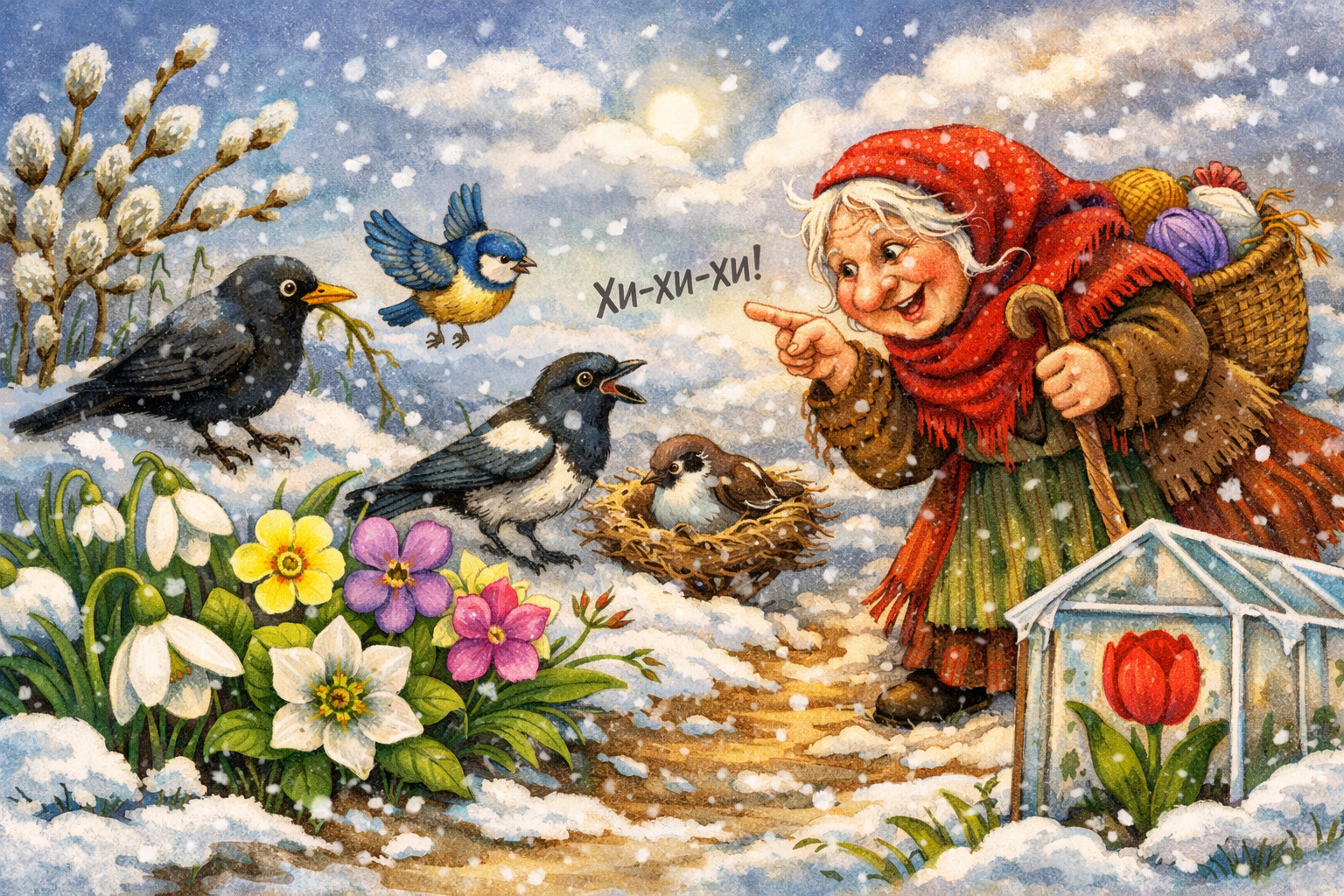 Одеднаш задува ветар. Почнаа да се веат и снегулки. Ранопролетниот разговор замре. Сите ги наведнаа главите и молчеа.